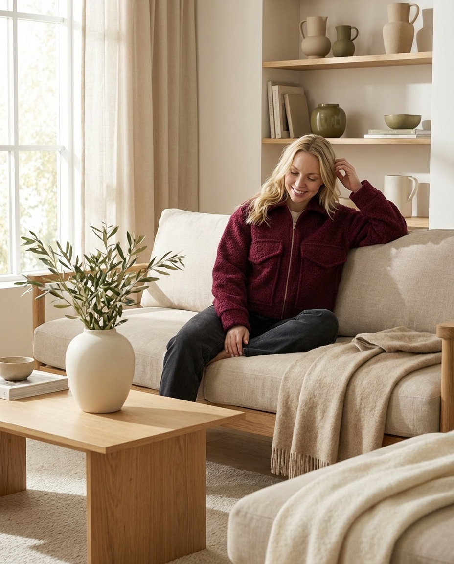 Pagaminta iš tekstūruoto buklės vilnos pojūčio audinio su lengvu vidiniu pamušalu, kuris suteikia šilumą be svorio.