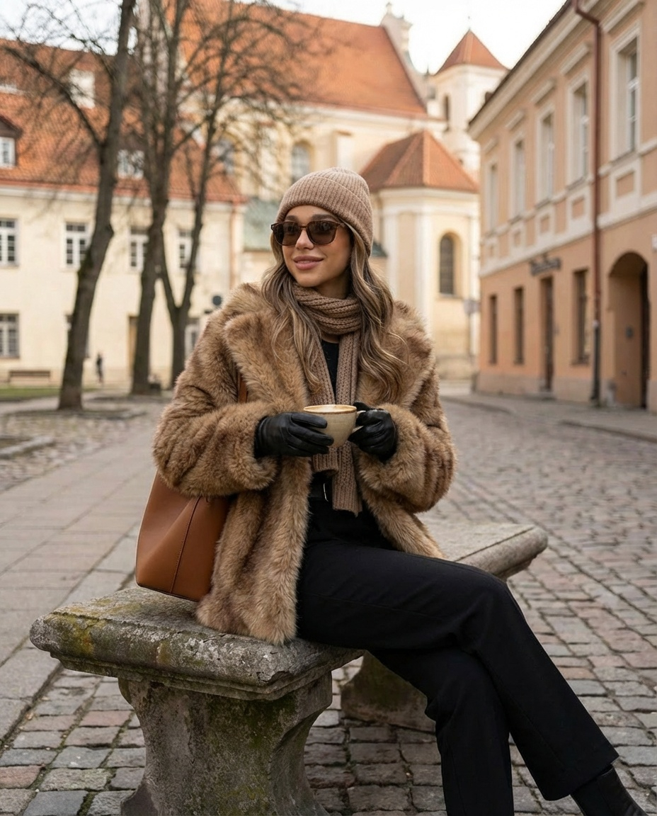 Laisvas siluetas, klasikinė kostiumo apykaklė ir rafinuotas šviesiai rudas atspalvis sukuria nesenstantį žiemos drabužį, kuris lengvai dera tiek kasdien, tiek iškilmingomis progomis. Baltijos žiemos elegancijos pareiškimas su moderniu ir etišku prisilietimu.
